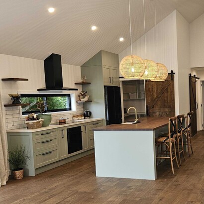 The kitchen is often the home of the house, and our client left nothing to chance in this area. Our client lovingly designed it—from the end shelving to house and keep pet bowls to the massive walk-in pantry with sensor lights—everything in this kitchen is exactly how she pictured it.